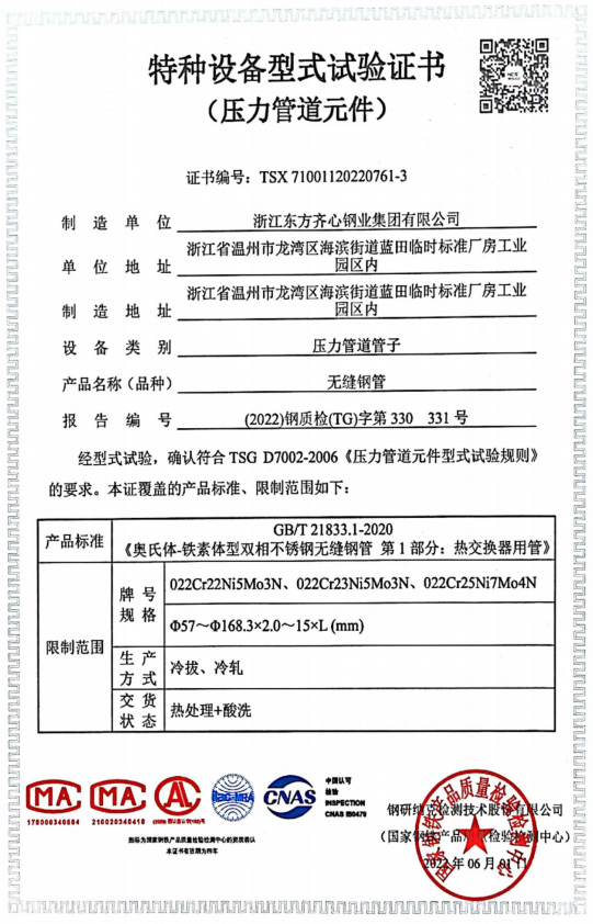 浙江東方齊心以不銹鋼系列產品為主導,品種有不銹鋼管、奧氏體不銹鋼管、高溫合金鋼管、雙相不銹鋼管、鎳基合金管、冷凝器用管、U形管、核電管、不銹鋼管件、法蘭、閥門等。規格有6-2020x0.8-60mm,Ф16-25長度可達33m。公司擁有精密制造鋼管的各類機械設備25臺(套),其中各類冷軋管機15臺, 冷拔機10臺,天然氣熱處理爐2套。